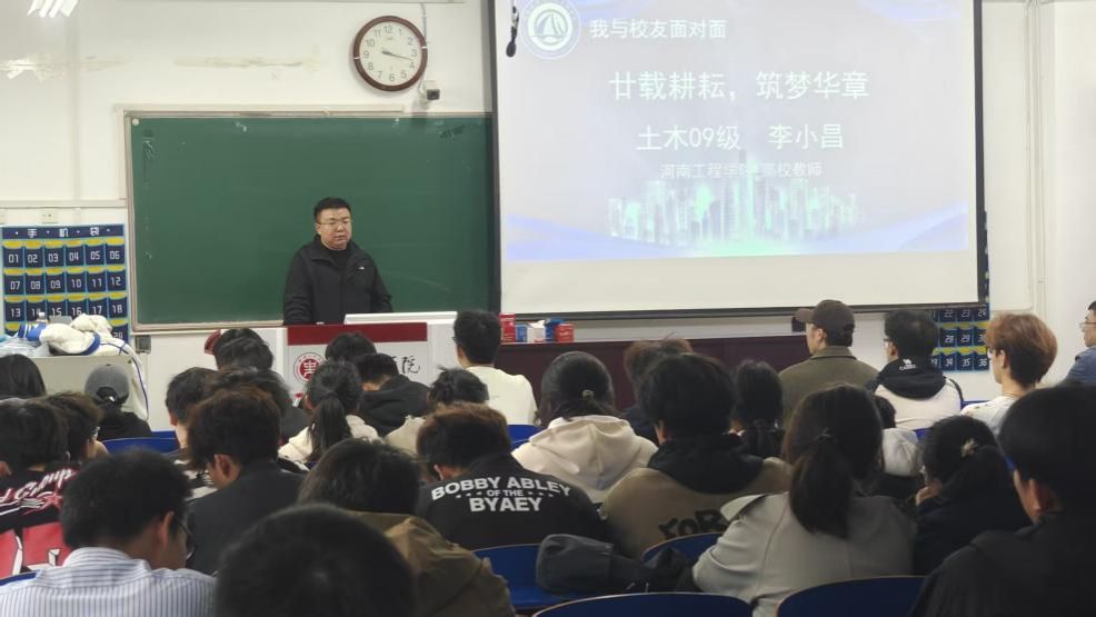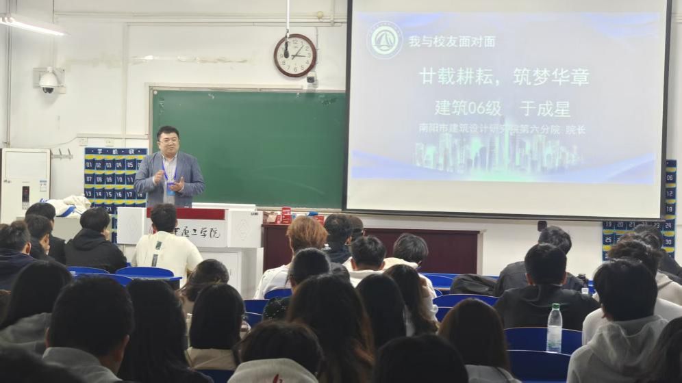 校友论坛环节,南阳市建筑设计研究院第六分院院长、高级工程师、河南省优秀青年勘察设计师于成星和河南工程学院教师李小昌分别结合行业实践与学术研究,为在校学生带来干货满满的讲座,分享职业发展经验与行业前沿动态,为学生规划未来提供宝贵参考。