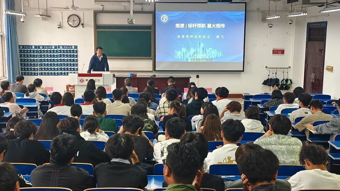 优秀考研进阶校友杨飞分享了自己的考研经验和成长历程。详细介绍了学院近年考研上岸情况,结合自身经历为新生提供了宝贵的学业规划建议。鼓励学弟学妹们要勇于追梦、砥砺前行,充分利用学院提供的优质资源,为实现人生目标不懈努力。