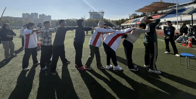 十人九足项目的队员们赛前充分磨合步伐节奏,入场后迅速站位绑好束腿带,肩搭肩、手挽手形成紧密整体。比赛中保持统一口号,步伐整齐,即便中途因节奏偏差短暂停顿,也能快速沟通调整,未出现摔倒或脱节,以稳定协作顺利完赛,尽显互帮互助的团队氛围。