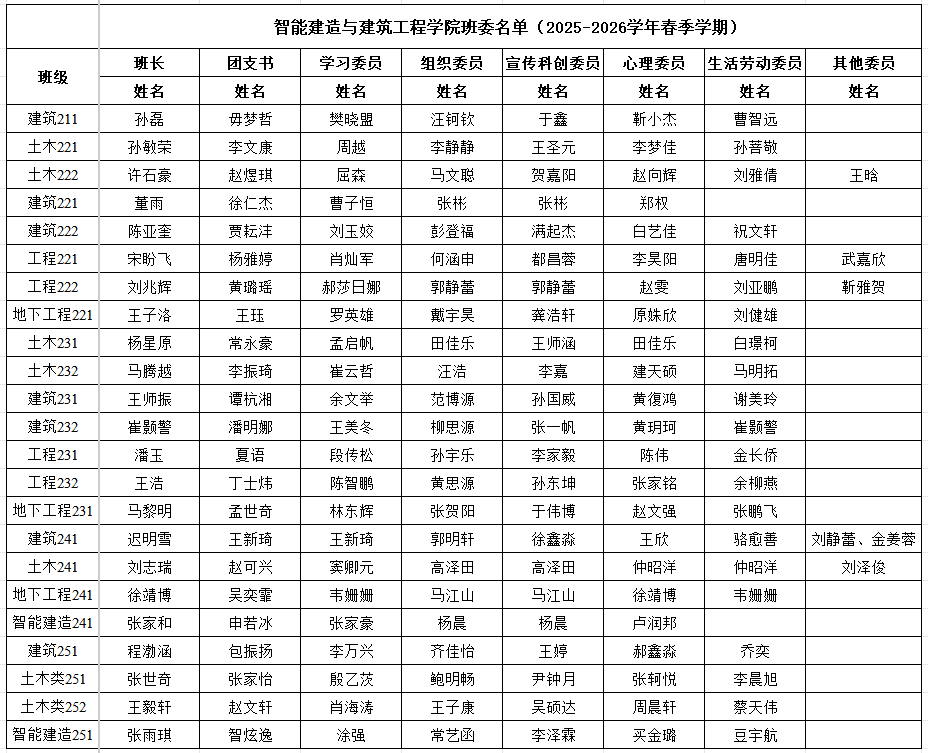 智能建造与建筑工程学院2025-2026学年春季学期班委名单