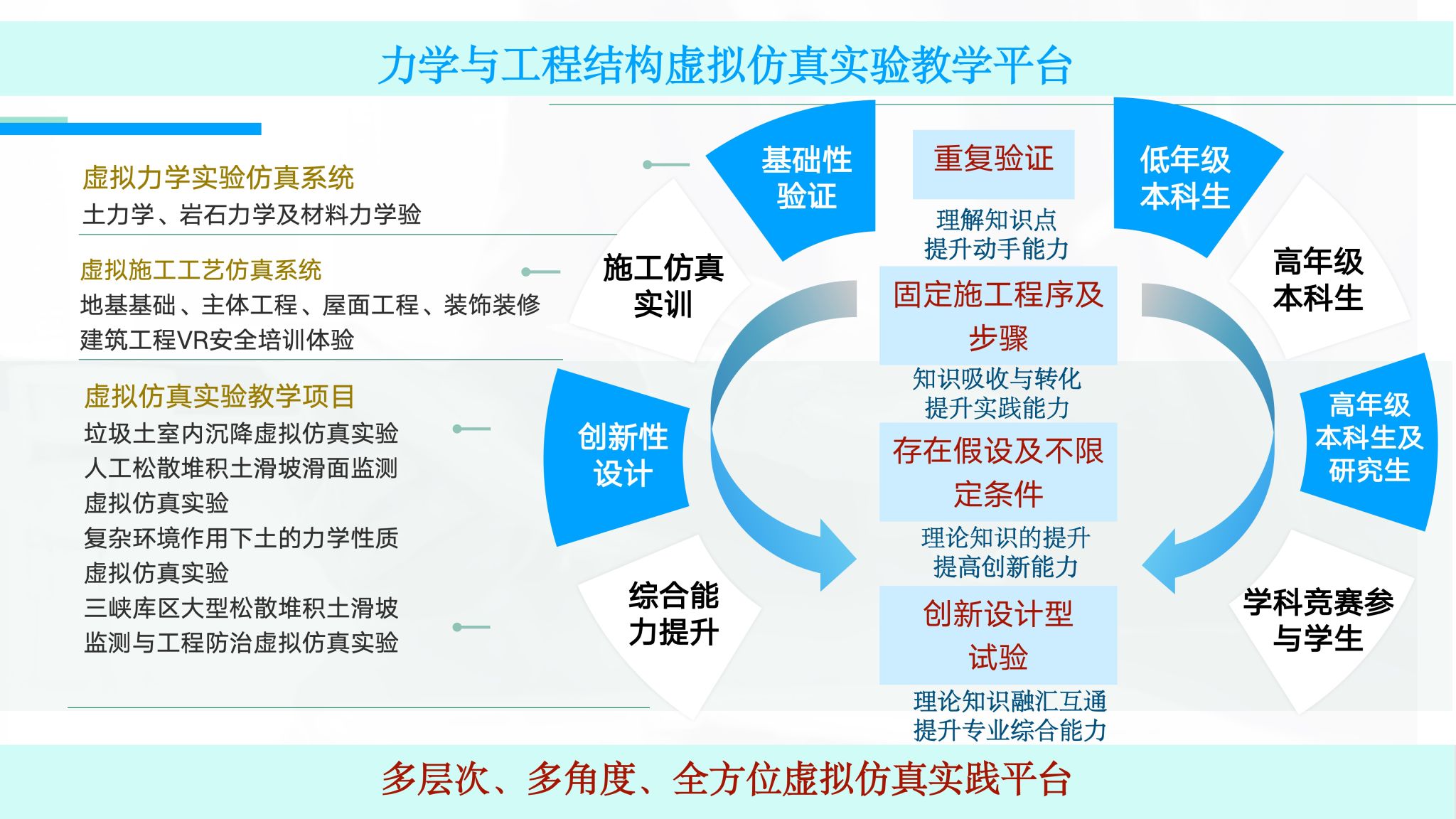 项目完成11项特色虚拟仿真实验项目开发,涵盖虚拟力学实验仿真系统、滑坡监测仿真等核心技术模块。建立实体实验“二维码工程”信息化系统,实现实践教学资源的数字化归档与智能调用。构建了“基础验证性实验-施工仿真训练-多变量创新实验-综合能力提升实验”四层次虚拟仿真实践平台,形成“实践-反馈-优化-再实践”的思政+专业双闭环机制。项目成果获批国家级一流本科课程1门,省级一流本科课程1门。发表教学改革类期刊论文8篇。开发《工程经济学》《环境岩土工程概论》等融合思政元素的特色教材。培养学生在学科竞赛中获国家级奖项5项,省级20余项。